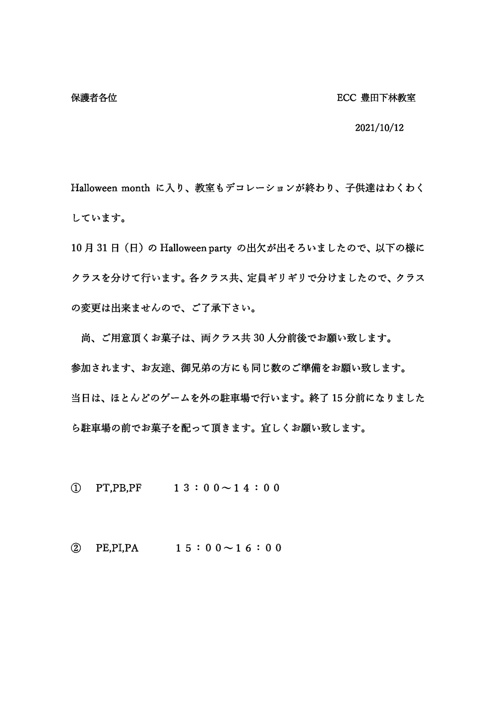 ECCジュニア豊田下林教室/高峯教室/ベストワン豊田校 下林教室Halloween 開催時間