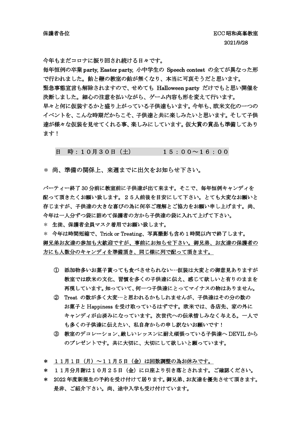ECCジュニア豊田下林教室/高峯教室/ベストワン豊田校 HALLOWEEN お知らせ